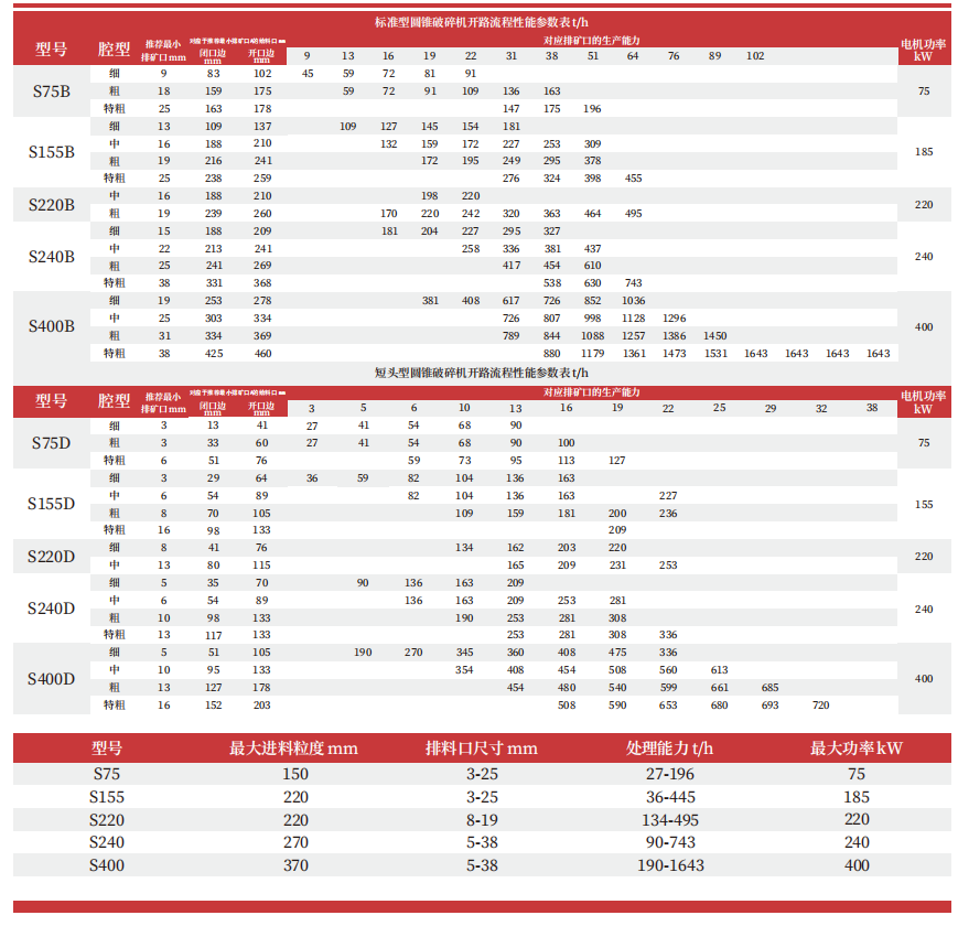 標準型圓錐破碎機開路流程性能參數表t/h